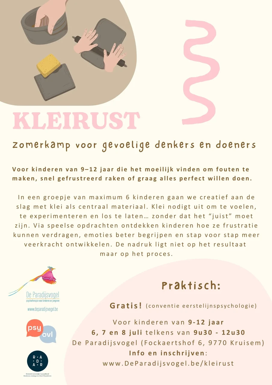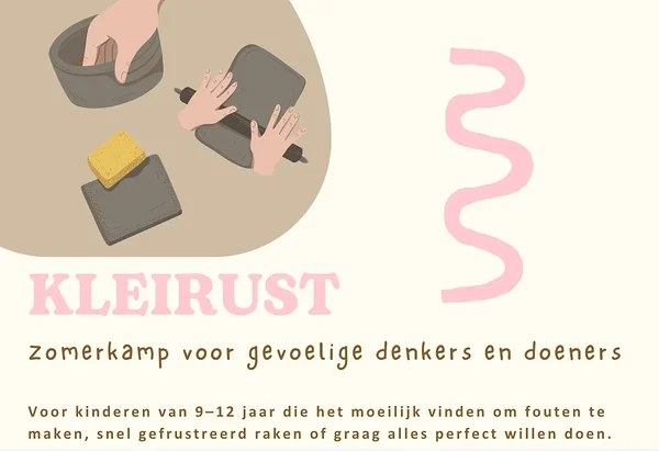 Tijdens Kleirust bieden we een warm, kleinschalig zomerkampje voor kinderen van 9 tot 12 jaar waarin ze op een speelse en veilige manier leren omgaan met emoties, fouten en uitdagingen.